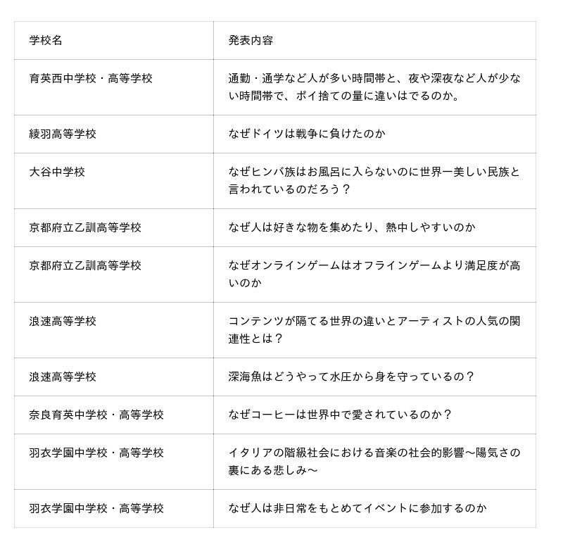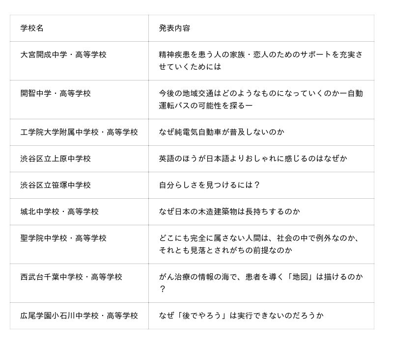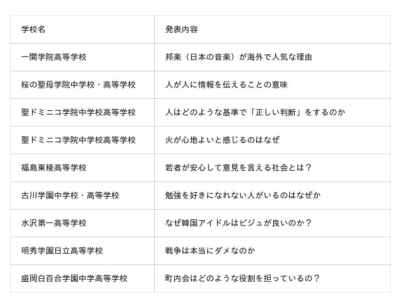 ※発表校および発表内容は、随時更新します。また、予告なく変更となる場合がございます。あらかじめご了承ください。