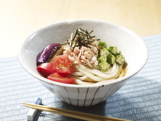 1. うどんはゆでて水洗いをし、水けをきって器に盛ります。