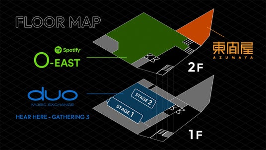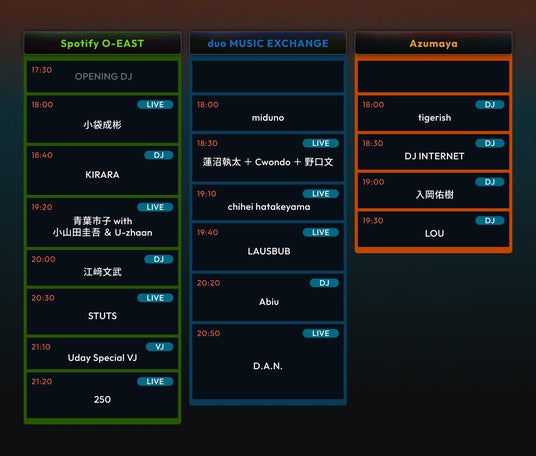 Spotify O-EAST、duo MUSIC EXCHANGE、東間屋、3会場のタイムテーブルを公開。duo MUSIC EXCHANGEは会場に2つのステージを設け、気鋭の音楽体験をお届けします。※Spotify O-EAST会場のみ17:30OPENとなりました