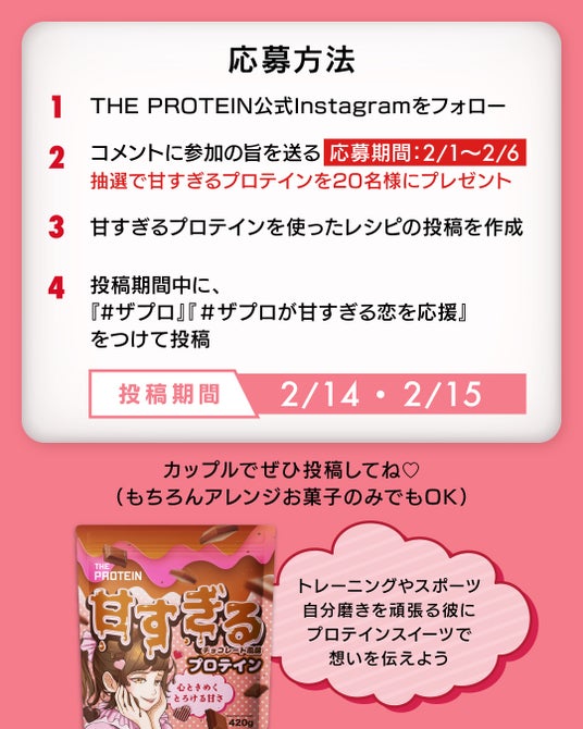 THE PROTEIN(通称:ザプロ)公式Instagramのキャンペーン投稿へコメントしてくれた人の中から抽選で20名様に「甘すぎるチョコレート風味」をプレゼント!当選した方は、「甘すぎるチョコレート風味」を使用したアレンジレシピをSNSに投稿