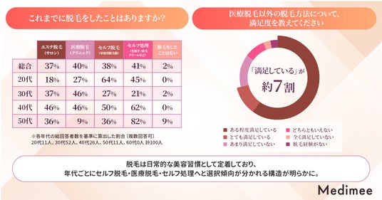 調査の結果、脱毛は日常的な美容習慣として広く定着しており、年代ごとにセルフ脱毛・医療脱毛・セルフ処理へと選択傾向が分かれる構造が明らかとなりました。