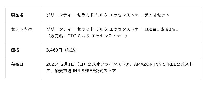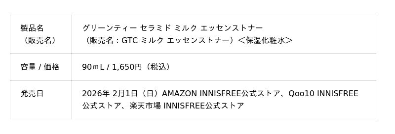 アモーレパシフィックジャパン株式会社(本社:東京都渋谷区)が展開する、自然主義アクティブスキンケアブランド [INNISFREE | イニスフリー] は、「まずは試してみたい」「毎日のケアでたっぷり使いたい」といった声にお応えし『グリーンティー セラミド ミルク エッセンストナー』のオンライン限定90mLサイズとお得に購入できるオンライン限定セットを2026年2月1日(日)より発売いたします。