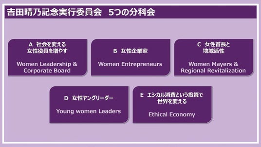 2019年に開催されたG20大阪では、20か国のジェンダー平等に関わる専門家によるW20(ウィメンズ20)から、「ジェンダーギャップの解消を通じた新しい成長のカタチ」をテーマに、労働、金融、デジタル、ガバナンスの4つの柱について提言が出されました。当時共同代表を務めた、経団連初の女性副議長でBT ジャパン社長の故吉田晴乃氏は、G20大阪首脳宣言におけるジェンダー平等を実現するために、2025年大阪・関西万博をウィメンズ EXPO にしようと提唱しました。吉田氏の遺志を継ぎ、立ち上がったのが「吉田晴乃記念実行委員会(HYMEC)」です。HYMEC では、あらゆる分野でのジェンダー平等の実現に向けて、さまざまな活動をおこなっています。意思決定層への女性の参画は日本の喫緊の課題です。日本政府や経団連は2030年に女性の役員・管理職比率を30%にすることを目標に、達成に向けて取り組みを進めています。HYMEC では、女性役員の比率を50%にすることで社会を変えることを目的に、女性のリーダシップ開発やネットワークの構築を目指し、連続セミナー「Road to Board」を毎年実施しています。現在、多くの修了生が役員や上級管理職へと昇進したり、海外転勤の機会を得たりするなど、幅広く活躍しています。彼女たちは世界の新しい経済成長の礎となり、その意志と情熱、行動力は、後に続く女性たちの羅針盤となるでしょう。