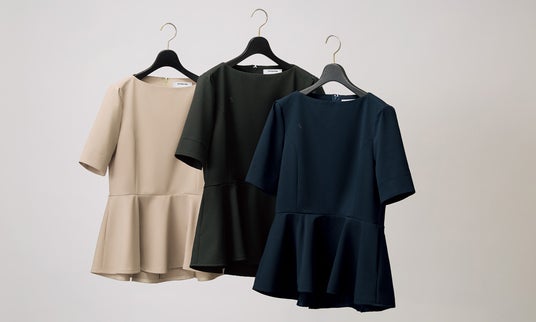 (品番:EN200)は、ESTNATIONを象徴する「ペプラムトップス」※1をベースに、深いお辞儀の際にもデコルテが美しく見えるよう「サブリナネック」※2を採用しました。薄く、しなやかな素材が自然なフレア感を表現、エレガンスで知的なシルエットを実現しました。