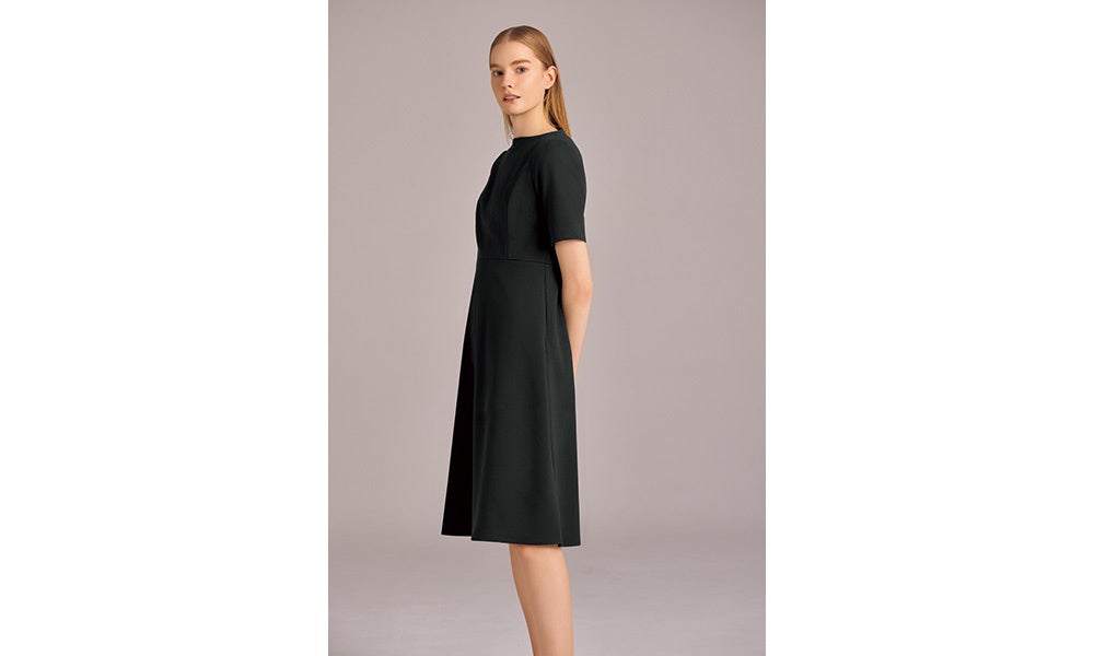 (品番:EN100)は、肩にさりげないタックを施し、控えめな華やかさと立体感をプラスしています。ウエストラインは自然にシェイプし、裾に向かってやわらかく広がるフレアシルエットが、動きに合わせて上品なドレープを描きます。