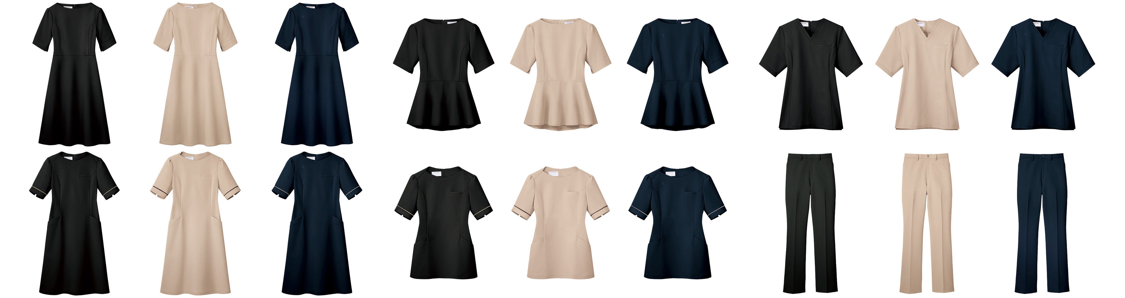 (品番:EN101・EN201)は、ゆとりあるシルエットでフロント受付から施術まで対応できるアイテムです。ゲストへのダウンサービスや移動式チェアーでの足捌きを徹底的に追求し、スリム過ぎず、ゆる過ぎない絶妙なシルエットを実現しました。