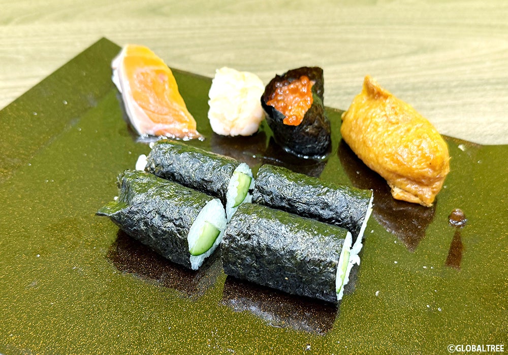 サーモンの握り、えびのてまり寿司、いくらの軍艦、いなり寿司、かっぱ巻きの5貫が完成