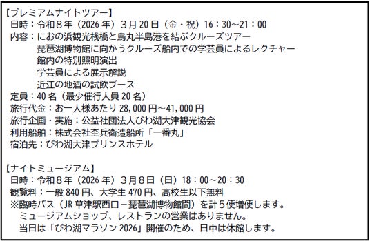琵琶湖博物館では、3月20日(金・祝)にホテル宿泊付きのプレミアムナイトツアー(40名限定)を実施します。1月27日(火)から受け付けを開始したところ、1月30日(金)18時ごろに完売しましたのでお知らせします。お申込み、お問合せをいただきありがとうございました。