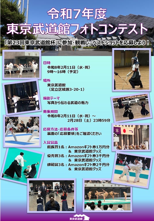 「スポーツで創る、東京の未来」をスローガンに、「スポーツフィールド・東京」の牽引役として様々な事業を展開する公益財団法人 東京都スポーツ文化事業団は、2026年2月11日(水・祝)に東京武道館(東京・綾瀬)で開催される「第23回東京武道館杯」にあわせ、大会に参加・観戦された方を対象に、活躍する選手の一瞬を切り取った写真を募集する「令和7年度 東京武道館フォトコンテスト」を開催します。