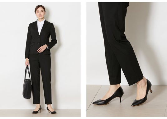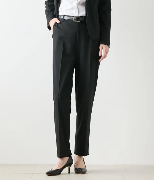 パンツスーツも、きちんと感を意識することでリクルートの場面にふさわしい装いとなります。センタープレス入りのテーパードシルエットは、すっきりとした印象で足さばきが良く、清潔感のある落ち着いた佇まいに。行動の多い就職活動を支える一着です。