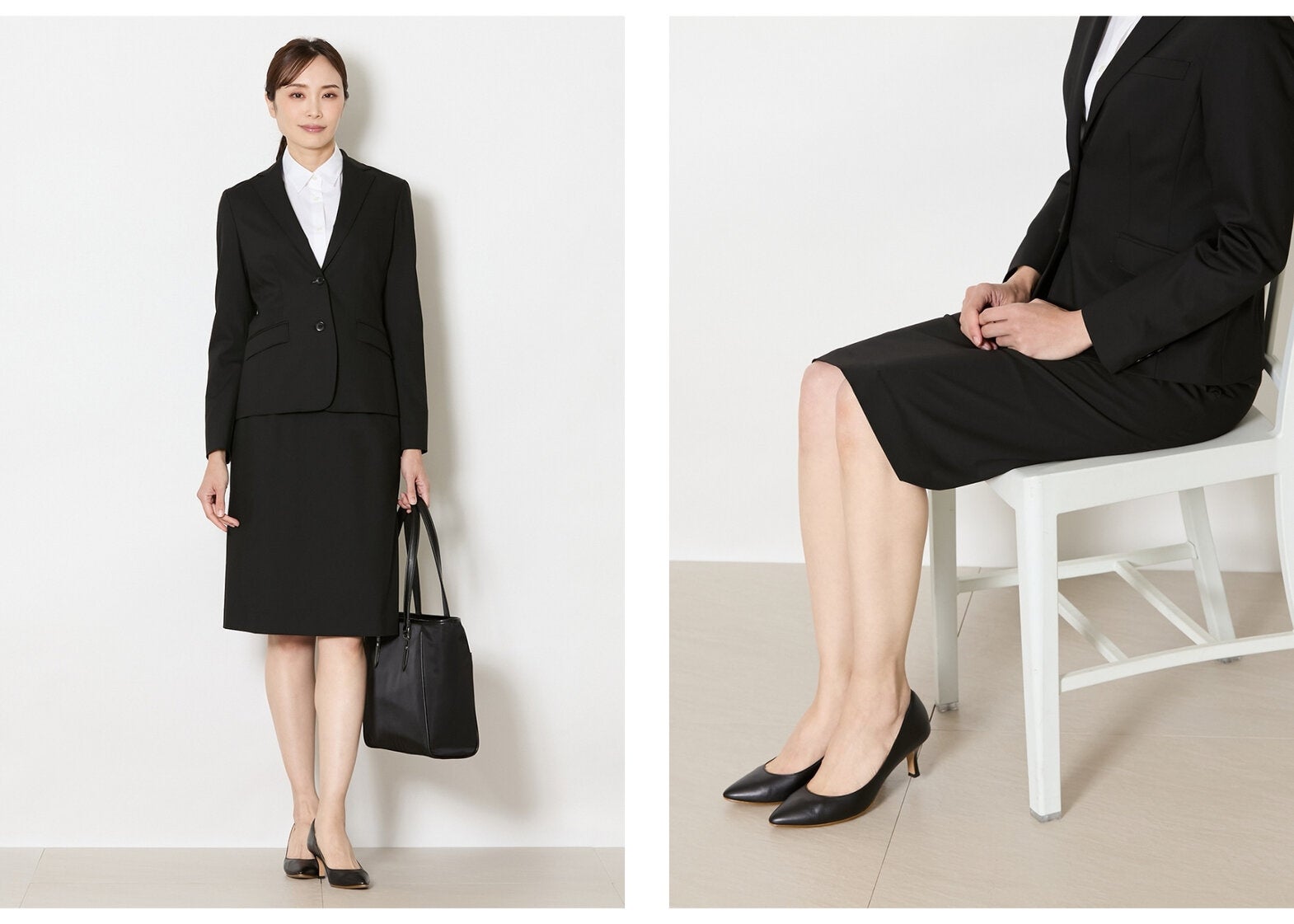 リクルートスーツの定番として、多くの場面で安心感のあるスカートスーツ。すっきりとしたシルエットは、清潔感と誠実さを演出します。膝の中心からやや隠れる着丈にするとバランスが良く、座った際にも露出を控えられます。迷ったときは、まず選びたい一着です。