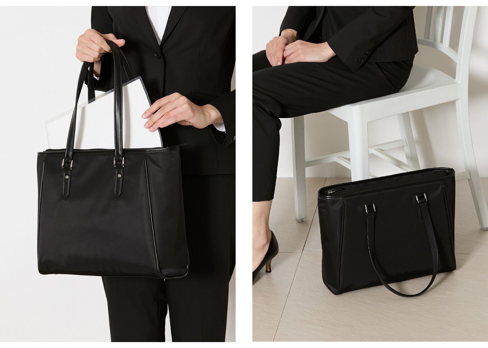 バッグは、自立するタイプを選ぶと、きちんとした印象になります。スーツに合わせた黒を基本に、A4サイズが収まるものが安心。装飾は控えめにし、面接や説明会にふさわしいシンプルなデザインを選びましょう。