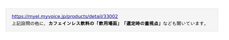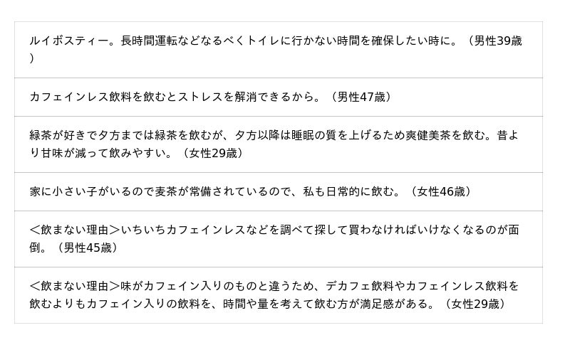本調査のカフェインレス飲料は、カフェインを含む飲み物のカフェインを除いたものや、その代替となるカフェインを含まないお茶類が対象です。水・牛乳・果汁ジュースなどは除きます。