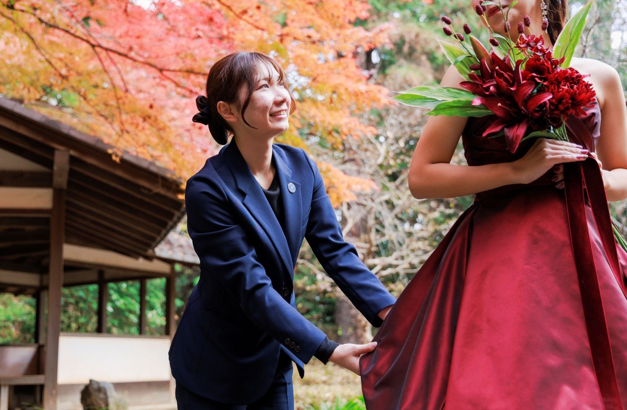 その経験をふまえ、今回は「小金井市市民結婚式~小金井市シヴィルマリッジ~」において、企画・制作・運営を担当。昨年5月から9か月間にわたり、ブライダル科の学生が、主役となる夫妻と面談を重ね、夫妻が望むテーマに沿った演出プランをもとに、式の構成を提案したり、ヘアメイクやドレス選び、ロケーションフォトの撮影などを実施してきました。