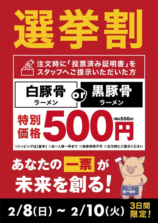 投票済み証明書持参で『白豚骨』または『黒豚骨』ラーメンが550円(税込)に!あなたの一票を、美味しさで応援!