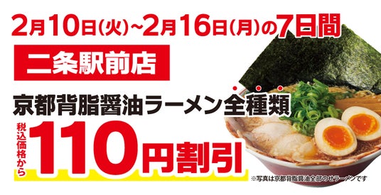 この度オープンを記念して、「二条駅前店」にご来店いただいたお客様には、『京都背脂醤油ラーメン全種類』を税込価格から110円割引で販売いたします。