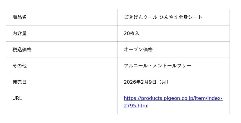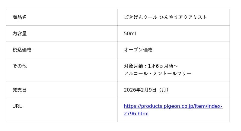 ピジョン株式会社(本社:東京、社長:矢野 亮)は、低刺激の冷感成分を配合し肌温度をマイナス2~3℃(※1,※2)まで下げる、お子さま向け暑さ対策シリーズ「ごきげんクール ひんやりアクアミスト」および「ごきげんクール ひんやり全身シート」を、2026年2月9日(月)より全国のベビー用品専門店・ドラッグストア、当社公式オンラインショップにて販売を開始いたします。