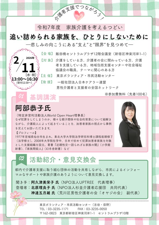 私ども東京ボランティア・市民活動センター(東京都新宿区/所長:山巻毅)は学習と交流を通して家族介護者及び、家族介護者を支援する方々同士のつながりを築き、課題の共有および解決策を考える場として、「家族介護を考えるつどい」を開催いたします。