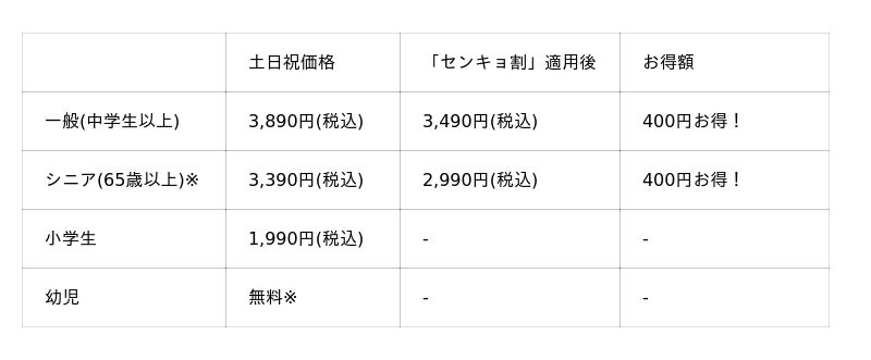※2「平日学割」は学生証ご提示の本人に限り有効です。「平日価格」・「平日学割」はキャンペーン開催期間中の土日・祝を除く平日のみが割引適用となります。「平日価格」の対象は一般・シニア料金のお客様です。
