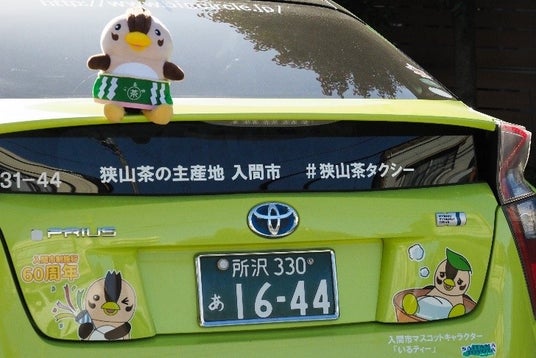 観光バスだけでなく、市内を走る同社のタクシーにも「いるティー」がラッピングされました。新茶を思わせるやさしい緑色の車体には、茶摘みをする「いるティー」や湯呑に浸かる「いるティー」が施されており、入間市が誇る狭山茶の主産地としてのイメージを表現しています。買い物や通勤、通院など日常の移動に寄り添うタクシーだからこそ、主張しすぎず、まちに溶け込みながらも印象に残るデザインとなっています。