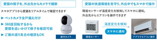全戸にペットカメラ・環境センサーを設置しており、外出先からスマホで室温管理や愛猫の様子確認が可能です。環境センサーが温度変化を検知し、スマホに通知。外出先からエアコン操作も可能で、愛猫の快適な環境を常に維持でき、共働き世帯や単身者でも、安心して猫を飼える環境を提供します。