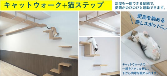 一般的なペット可の賃貸マンションでも、爪とぎによる壁や床の傷つきやすさから「猫はNG」とされるケースが多く、猫好きの方々にとって大きな悩みとなっています。「LEGALAND+猫MIYAKOJIMA」では、全戸「猫」特化仕様で多頭飼いも可能です。壁や床に傷がつきにくい素材や設計(抗菌・抗臭クロス、傷がつきにくい壁材、壁コンセント高設計)を採用するほか、キャットウォークや猫ステップなど、猫の運動を想定した、愛猫が自由に動き回れる空間を実現しています。