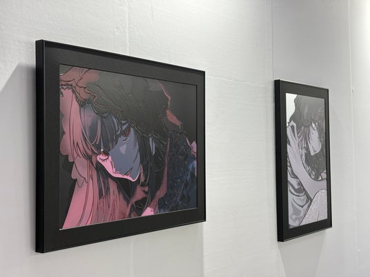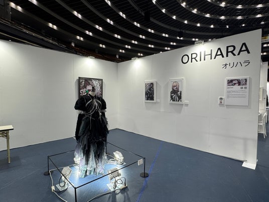 本展示では、世界的に人気を誇るデジタルアーティスト GUWEIZ(グウェイズ)と現代の人間像をテーマに表現を続ける ORIHARA の作品を展示。ORIHARAの作品は、妖しさや儚さ、美しさに加え、人物の強い眼差しや陰影によって時代性を感じさせる点が特徴で、デジタルアートを物理空間で体感する新しい鑑賞体験を生み出しました。