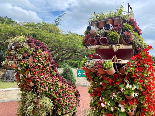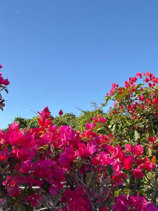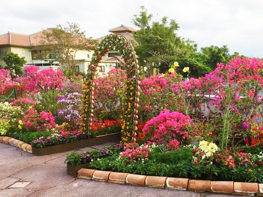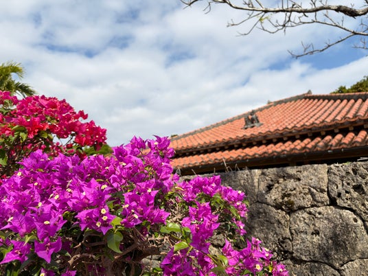 冬の寒い時期も温暖な沖縄は花の季節。ピンクのブーゲンビリア、その他にもたくさんの花々が。