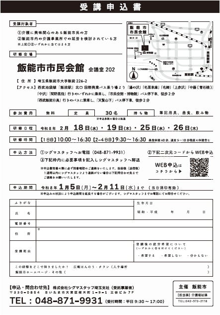 - 介護に興味関心のある飯能市民の方- 飯能市内の介護事業所での就労を検討している方