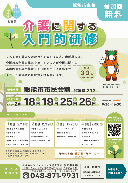 飯能市では、令和8年2月18日・19日・25日・26日の4日間「介護に関する入門的研修」を開催し、参加者を募集します。本研修は、介護に関する基本的な知識や技術を4日間を通じて学ぶ研修で、飯能市では初めての開催です。