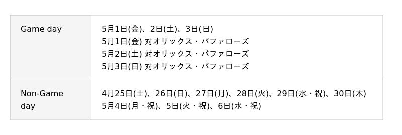 ※Non-Game dayのみの開催となります