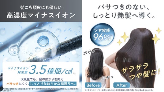 大風量でも髪がパサつかない秘密は、高濃度マイナスイオン。乾かしながら髪の水分バランスを整え、広がりを抑えて指通りなめらかな仕上がりへ導きます。ツヤ感のあるまとまりやすい髪を実感でき、ヘアケアに時間をかけられない新生活でも常に身なりを整え清潔感を作ってくれます。