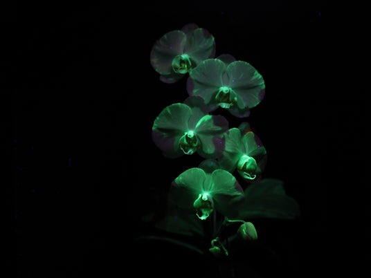 光るコチョウラン (暗室・紫外光下で)撮影
