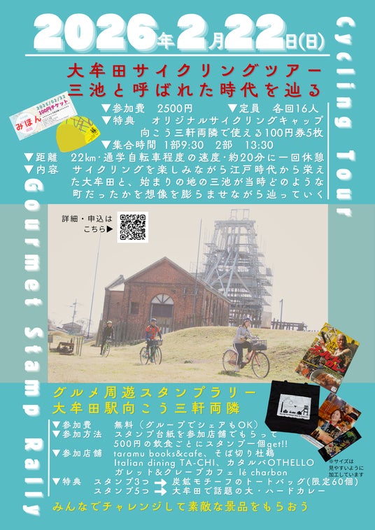 さらに、同日には大牟田駅周辺の飲食店にてグルメ周遊スタンプラリー「大牟田駅向こう三軒両隣」を実施!あわせてご参加ください。