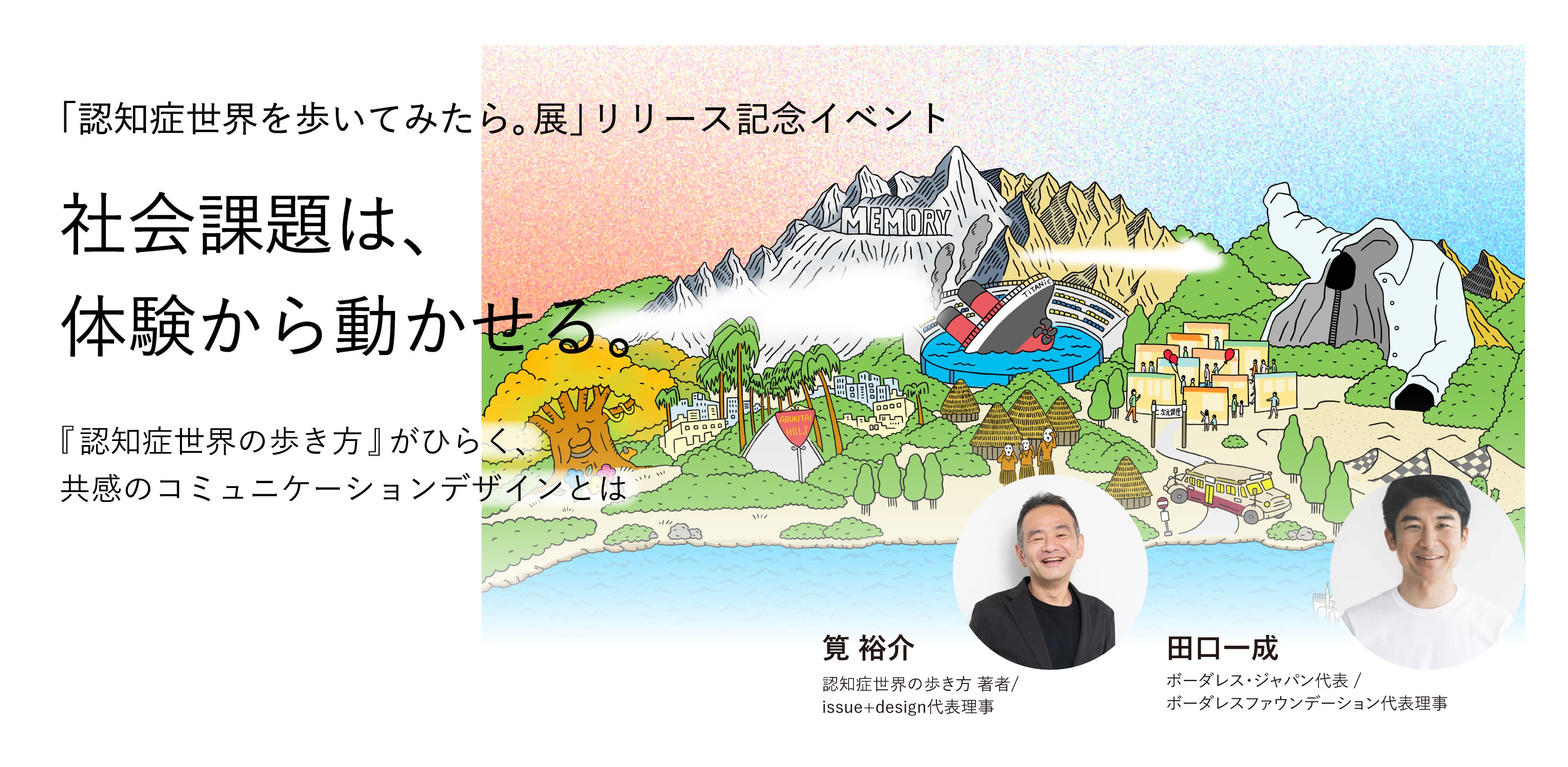 「認知症世界を歩いてみたら。展」のリリースに際して、「認知症世界の歩き方」の著者であり、issue+designの代表理事である筧さんの講演と、ボーダレスファウンデーション代表理事の田口を交えたトークセッションを行います。認知症という課題に対して、個人、企業、自治体など様々なセクターの人がそれぞれの立場からどんなことができるかを考えられる場にしたいと思います。どなたでも無料でご参加いただけます。ご希望の方は下記の「参加する」ボタンよりお申し込みください。