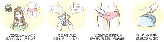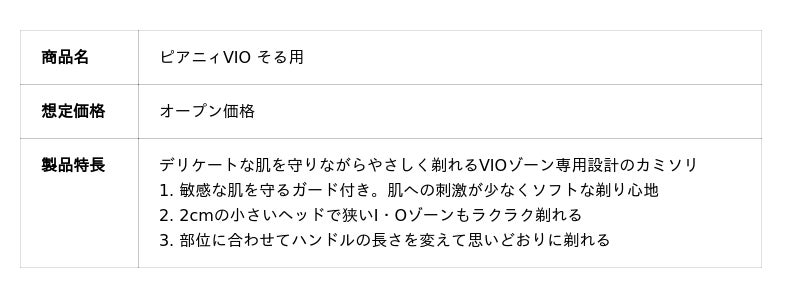 しかし、従来のVIO用カミソリに対しては「ヘッドが大きく使いにくい」「カミソリ負けしてヒリヒリした」といった不満の声が挙がっていました※。 こうした「見えづらい・狭い・デリケート」という部位特有の悩みを解決するため、販売実績100万個を突破した「ピアニィVIO へらす用」に続き、つるつるに剃りたい派のための専用設計モデルを開発いたしました。