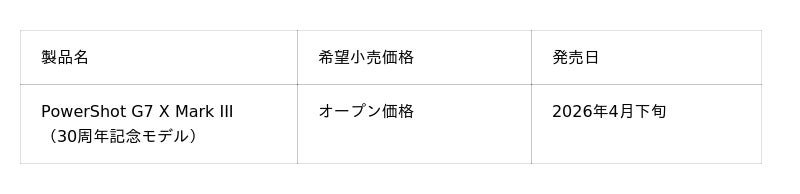 キヤノンのコンパクトデジタルカメラ「PowerShot」は、2026年で誕生30周年を迎えます。これを記念して、限定カラーの本体デザインや30周年記念ロゴが印字された特別仕様の「PowerShot G7 X Mark III」を2026年4月下旬に発売します。