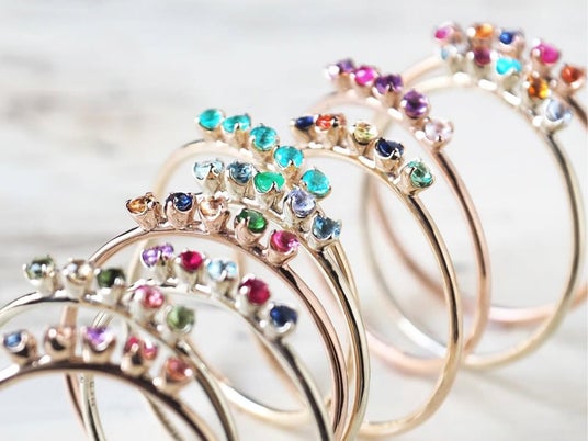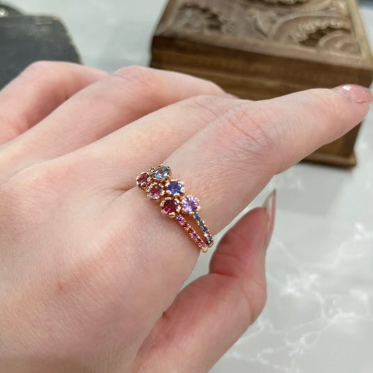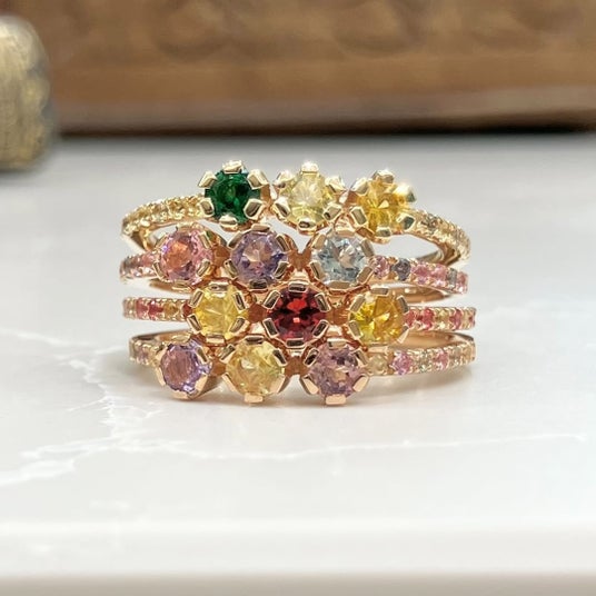 石座の高さを抑えた設計は、単体では静かな輝きを、重ね着けでは色彩の層を生み、指先に穏やかな光の連なりを描きます。