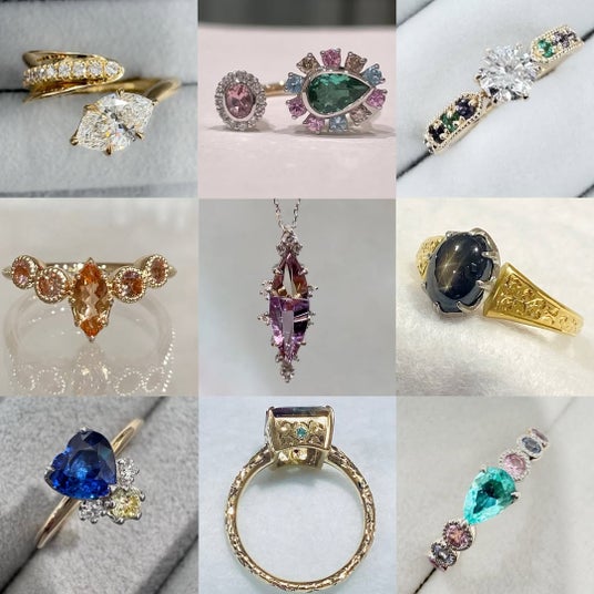 2月は、ブルーやグリーンを中心とした寒色系のバリエーションも順次ご案内いたします。色石の組み合わせや石種によって印象が大きく変わるため、一点ごとに異なる表情をお楽しみいただけます。