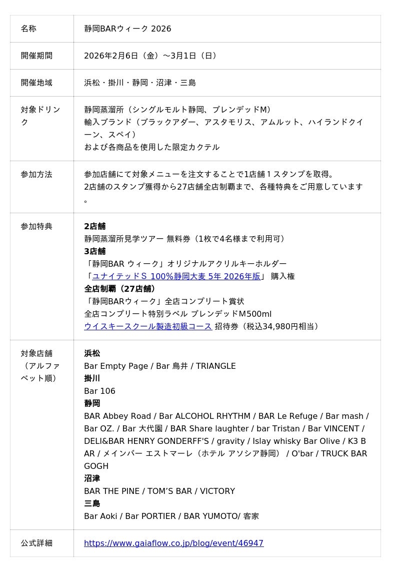 ガイアフロー株式会社(本社:静岡県静岡市、代表取締役:中村大航)は、2026年2月6日(金)から3月1日(日)の24日間、静岡県内の名店を巡るスタンプラリーイベント「静岡BARウィーク2026」を開催いたします。