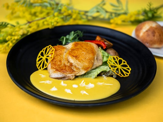 ホテル1階の「slash cafe & bar 川崎」では、”ミモザのブーケ”をイメージしたランチメニュー「鶏肉のコンフィ サツマイモとサフランソース添え」が登場します。香ばしいチキンコンフィに、古代より「愛」と深い結びつきのあるサフランと、サツマイモを使用したヴルーテソースを合わせ、皿の上に咲くミモザの花を表現しました。サツマイモの自然な甘みとサフランの香りが溶け合うソースは、お肉の旨味を引き立てるだけでなく、バゲットとも相性抜群。最後まで余すことなくお楽しみいただけます。