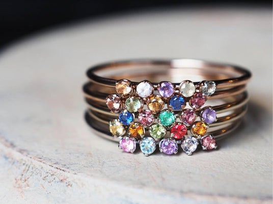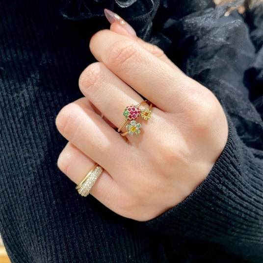 三点留めの繊細なセッティングにより、宝石本来の光を自然に取り込み、奥行きのある発色を引き出すお仕立て。1本でのさりげなさから、重ねることで、また表情を変えます。