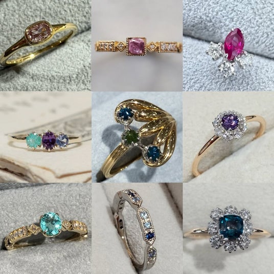 そのほか、テーパーカットのサファイアを一列に配したリングや、PARCELLE JEWELRYの創業者・成澤泰介(@taisuke_parcelle)が買い付けたルビーをあしらった「Mille Chainon(ミルシェノン)」、ダイヤモンドやアクアマリンで構成した「Mille Chainon(ミルシェノン)」など、多種多様なジュエリーを取り揃えております。