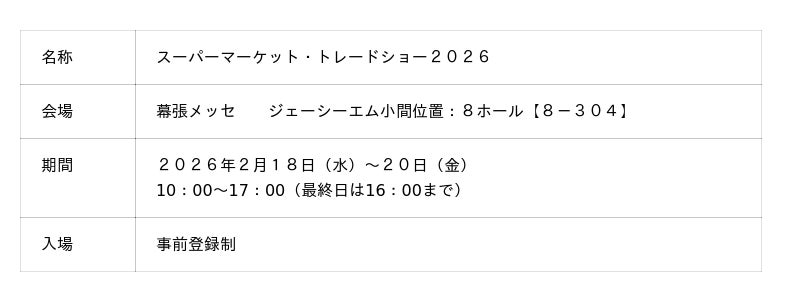 株式会社ジェーシーエム(本社:滋賀県草津市野村6-1-9)は2026年2月18日(水)から20日(金)まで、幕張メッセで開催される「スーパーマーケット・トレードショー2026」に出展します。