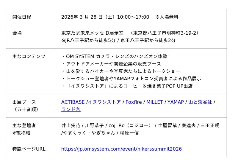 OMデジタルソリューションズ株式会社が展開する映像製品ブランド「OM SYSTEM」は、2026年3月28日(土)、ハイカーのための特別なイベント「HIKER’S SUMMIT」を東京たま未来メッセ(八王子)にて開催いたします。