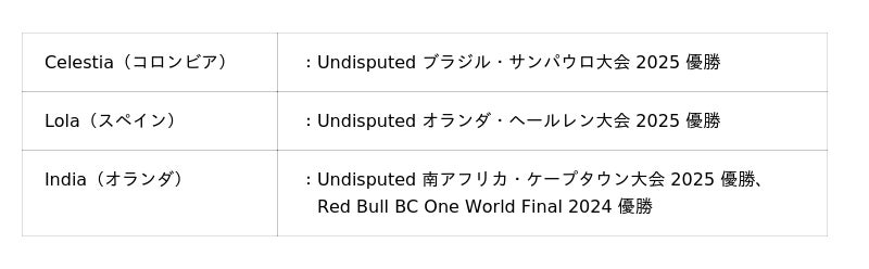 「FUJIFILM instax(TM) Undisputed」は、ブラジル・サンパウロ大会(2025年6月)、オランダ・ヘールレン大会(同年8月)、南アフリカ・ケープタウン大会(同年12月)、そして初開催となったインド・デリー大会(2026年1月)を通して、世界中のブレイキンコミュニティやブレイキンの文化を盛り上げてきました。これまでの大会には71か国から、2,469名のブレイカーが出場。今回の日本大会”Tokyo World Final”には4大会の優勝者が集結。さらに世界各地のブレイカーも加わる、世界王者を決める頂上決戦です。世界トップクラスのブレイカーたちによる熱いバトルが、観客席のすぐ目の前に設けられたダンスフロアで繰り広げられます。会場全体に満ちる熱気と一体感に包まれ、ブレイカーの息づかいまで感じられる臨場感あふれるバトルをお楽しみください。