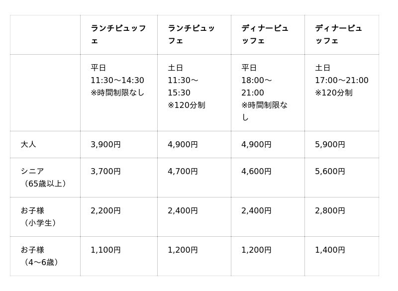 ※記載の料金は、消費税・サービス料込みの総額表示です。なお、ホテルメトロポリタン 川崎および高崎のビュッフェについては、サービス料を頂戴しておりません。
