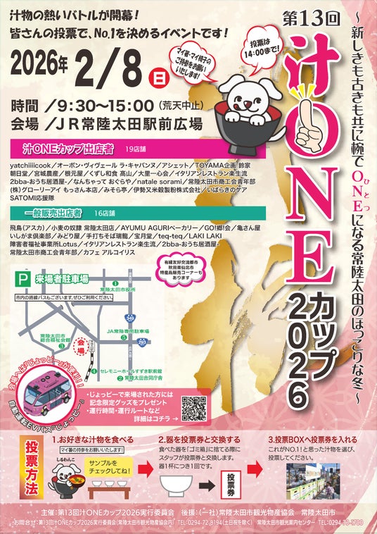 茨城県常陸太田市では、2月8日(日)に「第13回汁ONEカップ2026」を開催します。来場者投票で汁物料理のNo.1を決定します。常陸太田のほっこりな冬、皆さんのご来場をお待ちしています。