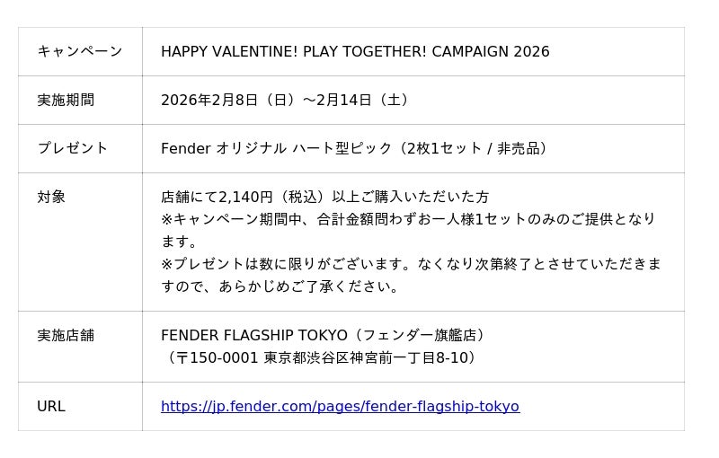 Fender Flagship Tokyo バレンタイン企画<HAPPY VALENTINE! PLAY TOGETHER! CAMPAIGN 2026>2026年2月8日(日)~2月14日(土)実施