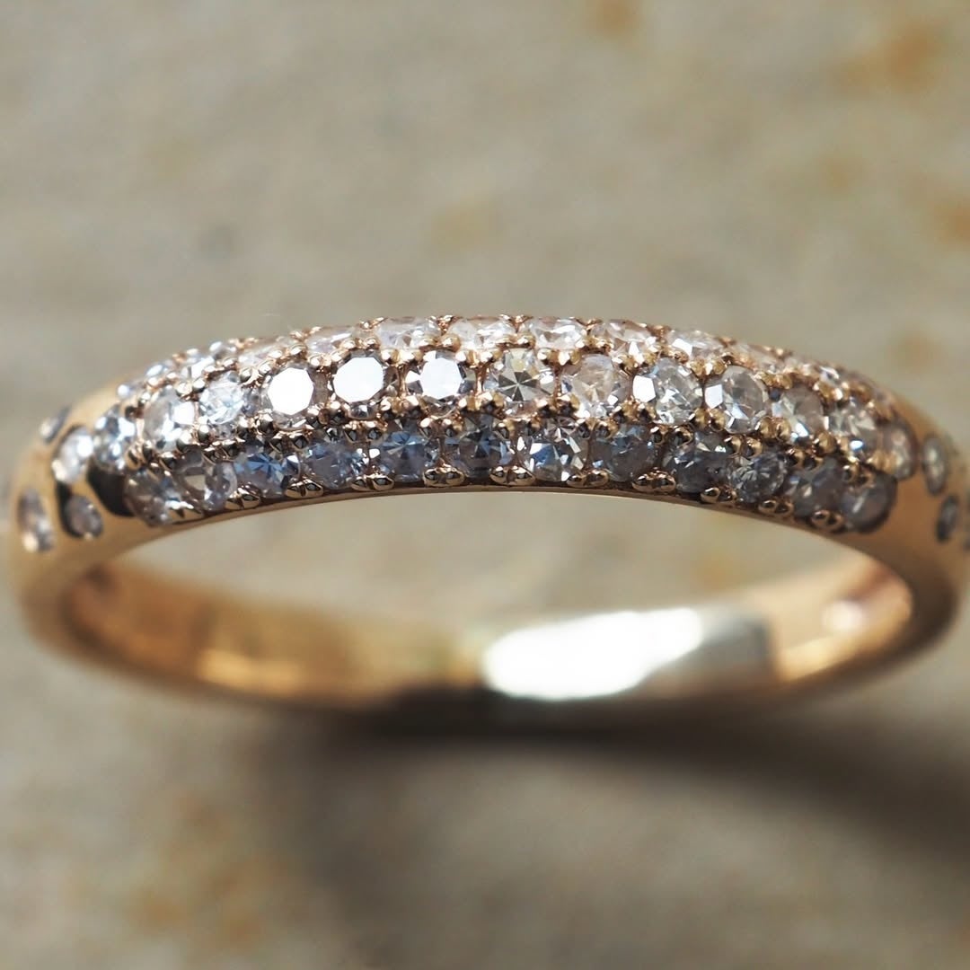 ■ Mira ― 宝石の色と光を映し出すパヴェリング「Mira(ミラ)」はイタリア語で“羨望の的”を意味します。やわらかく膨らみを持たせた地金の曲線に沿って、縁まで隙間なく宝石を敷き詰めたパヴェリングです。